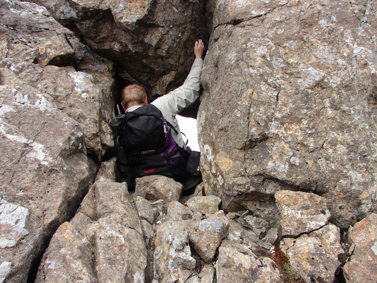 We komen bij een vrijwel loodrechte schoorsteen van zo’n 10 meter hoog. Ik geloof dat het de Tooth Chimney is. Het ziet er zeer intimiderend uit maar ik zie duidelijk treetjes en bobbels en mogelijkheden voor spreidstanden. Als meest ervaren klimmer mag ik het eerst proberen. Na wegslikken van de angst ontdek ik dat het best meevalt, weer omdat de gabbro zo ruw is en je niet het gevoel hebt dat je schoen zo van een tree kan wegslippen. Dat gevoel heb ik altijd op de kalksteen in Belgie.