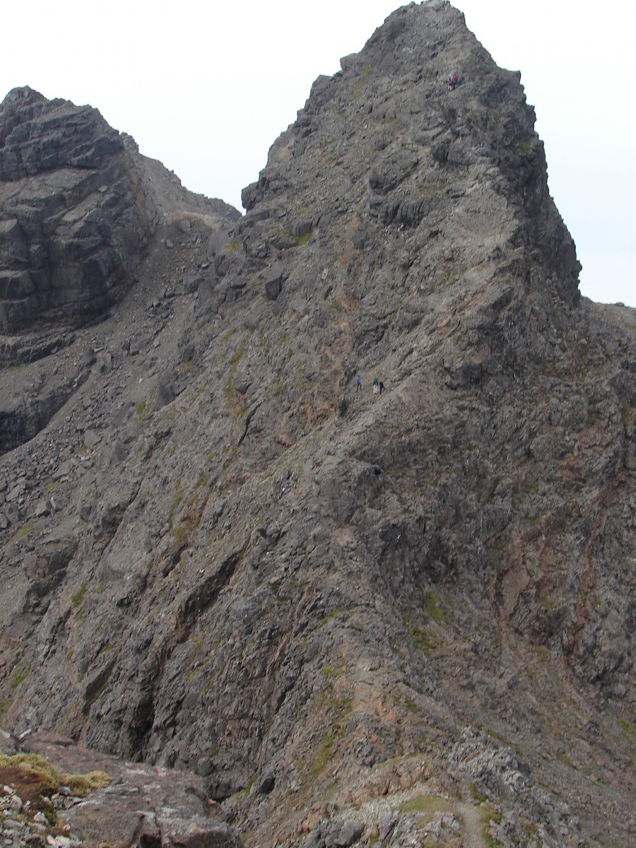 De sleutelpassage onder de eerste(lagere) piek van Am Basteir bevindt zich net boven de mensen.Er hangt een touw.Verderop zie je de grote pieken van Gilean.
